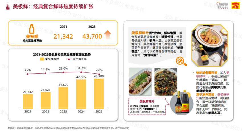 美極鮮等經(jīng)典復(fù)合調(diào)味品的應(yīng)用擴(kuò)大就是最好的佐證。2025年,美極鮮相關(guān)菜品推薦數(shù)進(jìn)一步增至43700,相比2021年的21342,近乎翻倍增長(zhǎng)。