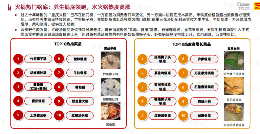 《2026中國(guó)中式餐飲白皮書(shū)》顯示,竹笙椰子雞、胡椒豬肚雞等清淡養(yǎng)生的產(chǎn)品,以及土雞菌湯鍋、野生菌火鍋等有料養(yǎng)生鍋底,都位列火鍋Top10熱推菜品,受到消費(fèi)者的青睞。