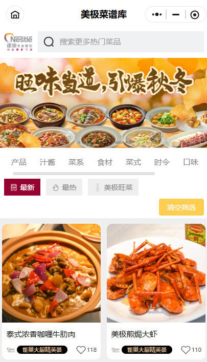 “雀巢大廚精英薈”小程序匯聚了2000多道旺菜菜譜,方便廚師隨時(shí)查閱。更人性化的是,小程序內(nèi)的海量菜譜,按照食材、菜系、口味等多種維度進(jìn)行分類(lèi),同時(shí)還支持交叉篩選,讓廚師可以精準(zhǔn)鎖定目標(biāo)菜譜,進(jìn)而激發(fā)創(chuàng)新靈感。