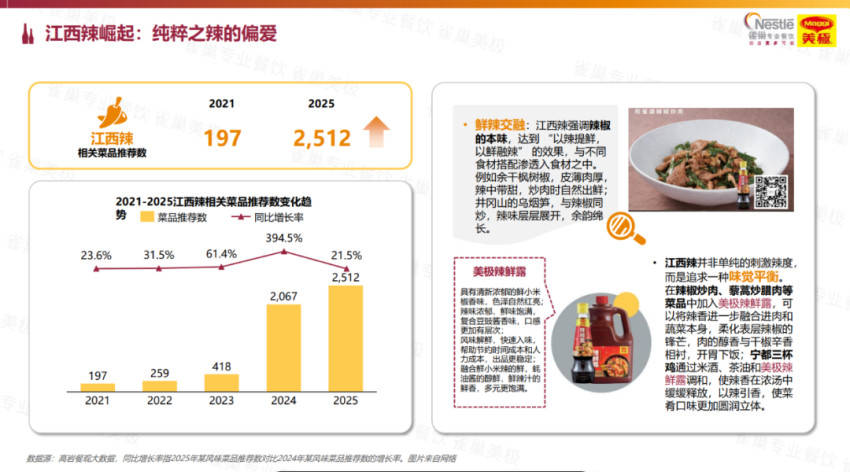 此外,像江西辣這樣純粹的、不同等級(jí)的辣,熱度也在快速上升。數(shù)據(jù)顯示,2021年至2025年,江西辣相關(guān)菜品推薦數(shù)由197增長(zhǎng)至2512,增長(zhǎng)顯著。