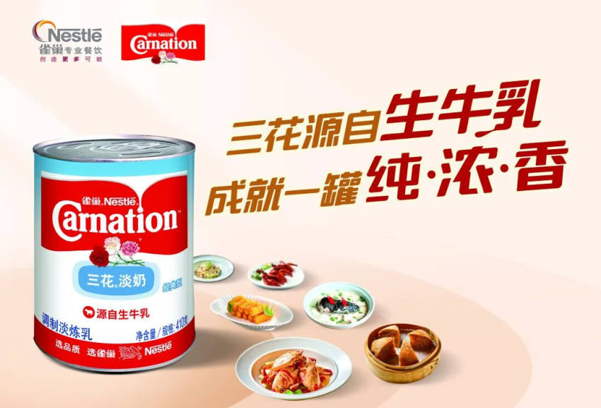 除了風(fēng)味加持,雀巢三花淡奶濃醇順滑的質(zhì)地,還能優(yōu)化菜品質(zhì)地,并發(fā)揮增色提亮的作用。目前,該產(chǎn)品已經(jīng)廣泛運(yùn)用于湯羹、涼菜、甜品、熱菜多類(lèi)菜品,適配多種烹飪方式。