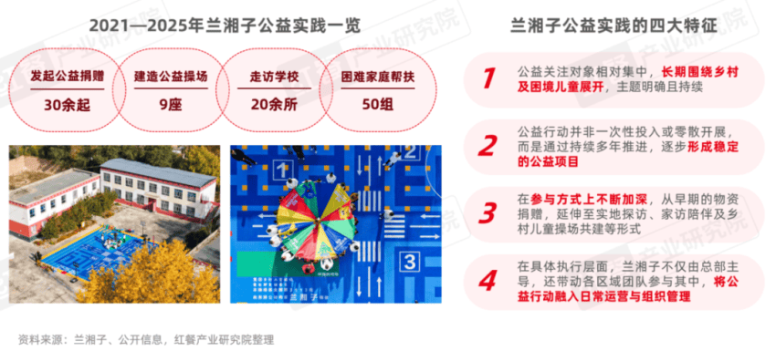 在此背景下,主動承擔(dān)社會責(zé)任已成為餐飲品牌構(gòu)建長期信任與情感價值的重要途徑。在湘菜賽道中,蘭湘子自2021年起,圍繞鄉(xiāng)村教育及兒童成長持續(xù)開展相關(guān)公益項目。一方面,蘭湘子聯(lián)合美團(tuán)、壹基金推進(jìn)鄉(xiāng)村兒童操場公益項目,累計捐建9座操場;另一方面其通過自主對接學(xué)校、困難家庭及殘障兒童機(jī)構(gòu),開展圖書和運動器材等物資捐贈、入戶家訪及生活物資幫扶等公益活動。蘭湘子積極將社會責(zé)任系統(tǒng)化地融入品牌經(jīng)營發(fā)展戰(zhàn)略中,使公益成為品牌價值的重要組成部分。