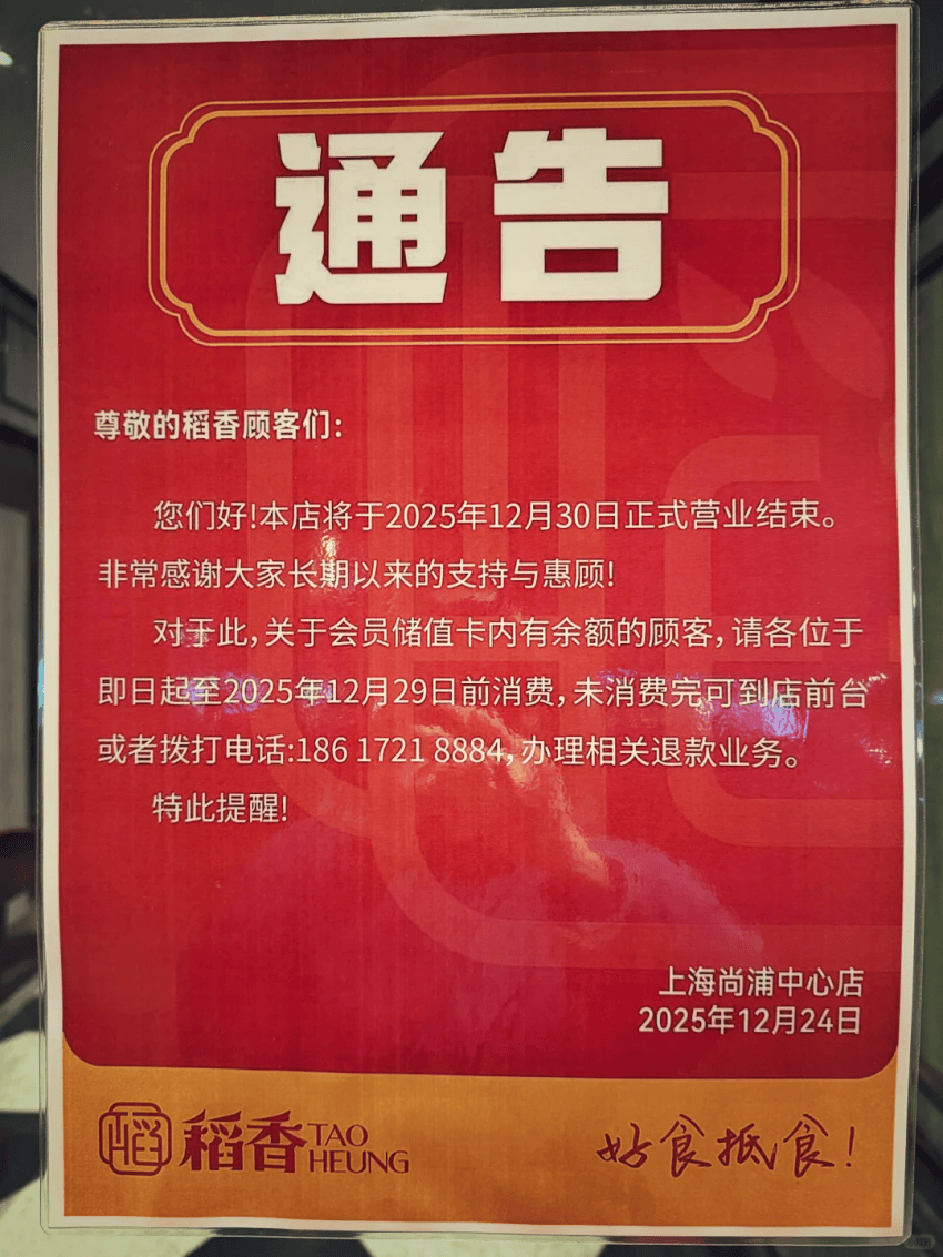 紅餐網(wǎng)消息,近日,有網(wǎng)友發(fā)帖分享,稻香尚浦中心店于2025年12月30日結束營業(yè)。據(jù)悉,該店為全上海最后一家稻香門店,這也意味著,稻香已全面退出上海市場。