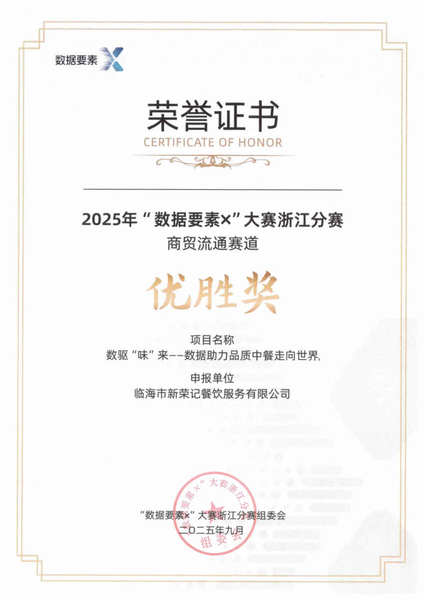 “數(shù)據(jù)要素X”大賽是國(guó)家數(shù)據(jù)局聯(lián)合20多個(gè)部委舉辦的全國(guó)性賽事,作為國(guó)內(nèi)首個(gè)聚焦數(shù)據(jù)要素開(kāi)發(fā)與應(yīng)用的國(guó)家級(jí)競(jìng)賽,其權(quán)威性與引領(lǐng)性備受認(rèn)可,賽事吸引了全國(guó)超過(guò)2.2萬(wàn)支隊(duì)伍報(bào)名參賽,新榮記作為一家民營(yíng)餐飲企業(yè),在這個(gè)數(shù)字化的專業(yè)賽事中,拿到省優(yōu)勝獎(jiǎng),可見(jiàn)其數(shù)字化成果之顯著。