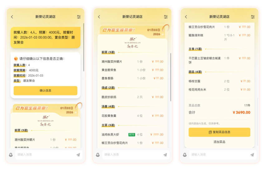 該系統(tǒng)不僅優(yōu)化顧客體驗(yàn),更成為企業(yè)內(nèi)部協(xié)同樞紐。它可根據(jù)時(shí)令食材上市、庫(kù)存情況自動(dòng)優(yōu)先推薦目標(biāo)菜品,實(shí)現(xiàn)“庫(kù)存-排菜-銷(xiāo)售”數(shù)智化協(xié)同,推動(dòng)前后端高效聯(lián)動(dòng),鞏固了新榮記米其林級(jí)服務(wù)與出品優(yōu)勢(shì),沉淀了可復(fù)制的數(shù)智化運(yùn)營(yíng)能力。