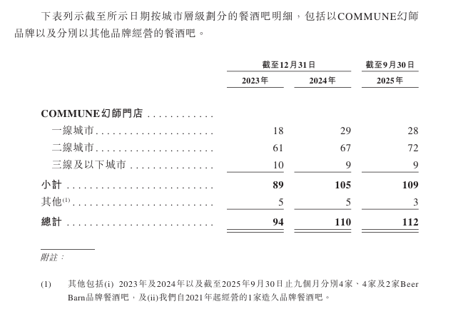 近年來COMMUNE幻師的門店數(shù)量穩(wěn)步增長。COMMUNE幻師招股書披露,其門店由2023年底的94家增加至截至2024年末的110家;到2025年9月底,COMMUNE的餐酒吧已在全國40個城市落地112家直營門店。COMMUNE幻師還制定了今后三年的穩(wěn)步拓店計劃,其中2026年將聚焦一、二線城市,新開30至40家門店;之后2027年則同步深化低線市場布局,新增35至45家門店;2028年將進一步拓展40至50家門店,以持續(xù)擴大在高潛力消費區(qū)域的覆蓋。