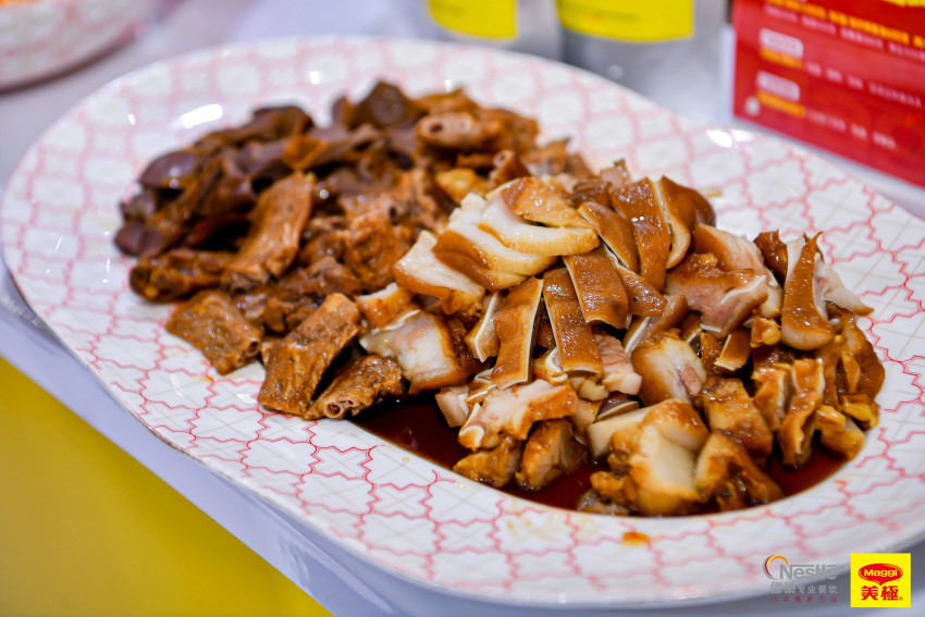 展臺上的一款潮汕鹵水,使用了美極潮汕鹵水汁來調(diào)配味型。這款汁醬可以去腥提味,使菜品色澤紅亮,幫助廚師解決肉類食材去腥麻煩、鹵水入味難、色澤不夠鮮亮等難題,同時適用于家禽、肉類、豆制品等食材,一醬多用,助力餐廳實現(xiàn)鹵味的穩(wěn)定出品。