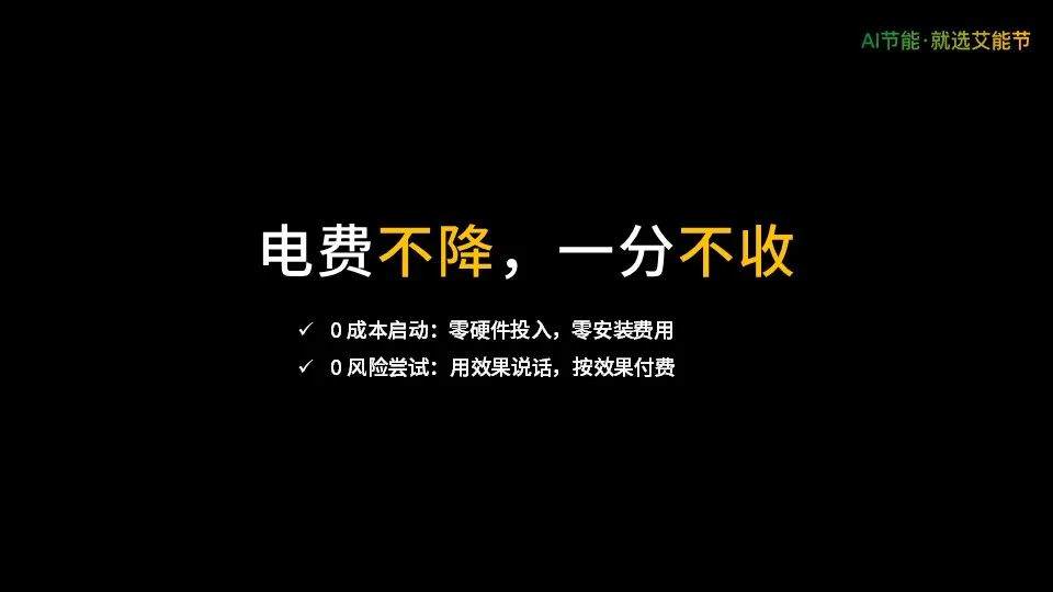 艾能節(jié)的合作模式同樣引人注目:電費不降,一分不收。零硬件投入、零安裝費用,0成本啟動、0風險嘗試,完全用效果說話,按效果付費。這不僅是一種商業(yè)承諾,更是對“確定性”的極致追求——讓客戶零風險鎖定節(jié)能收益,將不確定的成本支出轉化為確定的利潤貢獻。